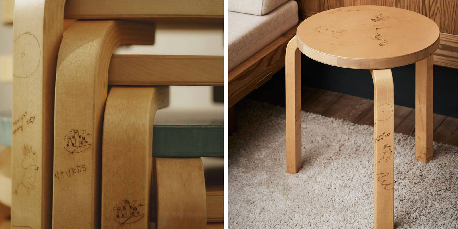 The iconic three-legged Artek stool, designed in 1933, celebrates Artek’s 90th anniversary. Stool 60 Celebration is part of the Artek + Moomin collection, which includes the stool 60 and the cabinet 250.