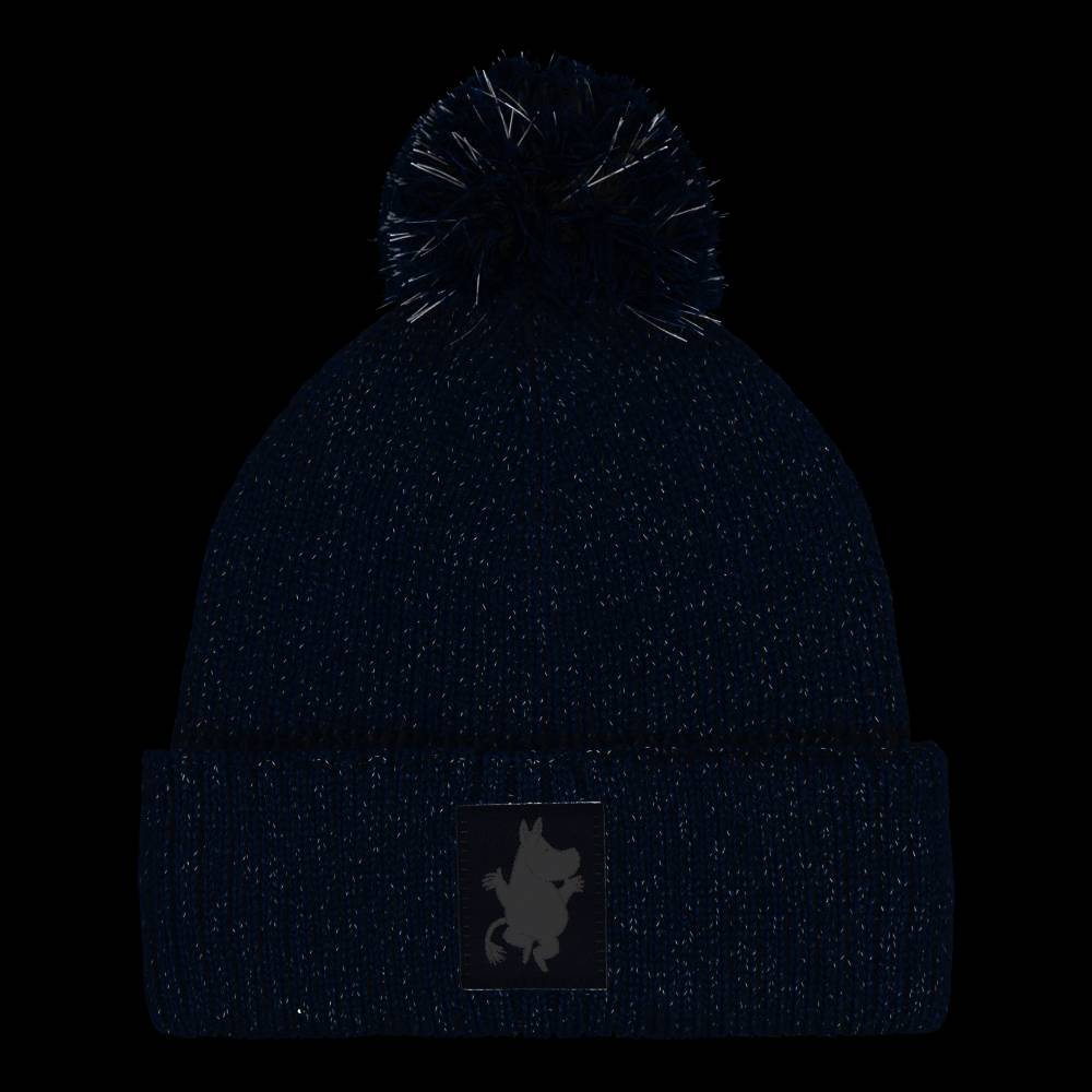 A literally shining beanie, which makes you visible 360°. The beanie is woven with reflecting yarn all over. The pompom also includes reflective yarn. Inside a warm microfleece lining. A happy Moomintroll dancing in the front and the Luminary - Moomin logo as a tag in the back seam.