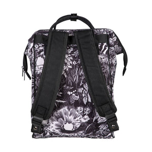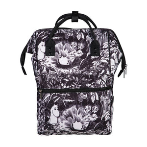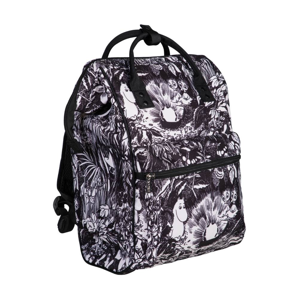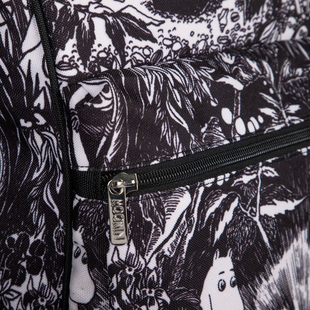 A spacious Moomin backpack made of sturdy polyester canvas featuring Bob & Thingumy and the King’s Ruby. With a padded back and adjustable shoulder straps. A large inner pocket and a zip-up front pocket. The metal parts colour is silver.
