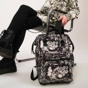 A charming putty backpack that fits a 14" laptop or tablet. This versatile backpack has a metal frame that keeps the entire top open. Dirt and water-repellent material. Carrying handles that can be fastened together with snaps. Padded back and padded, adjustable shoulder straps with breathable mesh fabric underneath. The ends of the shoulder straps can be neatly rolled up. Two-way zipper closure. Shaped and padded bottom. Large zippered pocket on the front. Faux leather Moomin logo. Lined interior. The interior seams are finished with cotton binding tape, which makes the bag particularly durable. Dimensions 25 x 38 x 16.5 cm. The volume is about 15 litres. This spacious rectangular backpack has been carefully designed with comfort in mind and is ideal for schoolchildren, students, excursions and trips, or even for work.