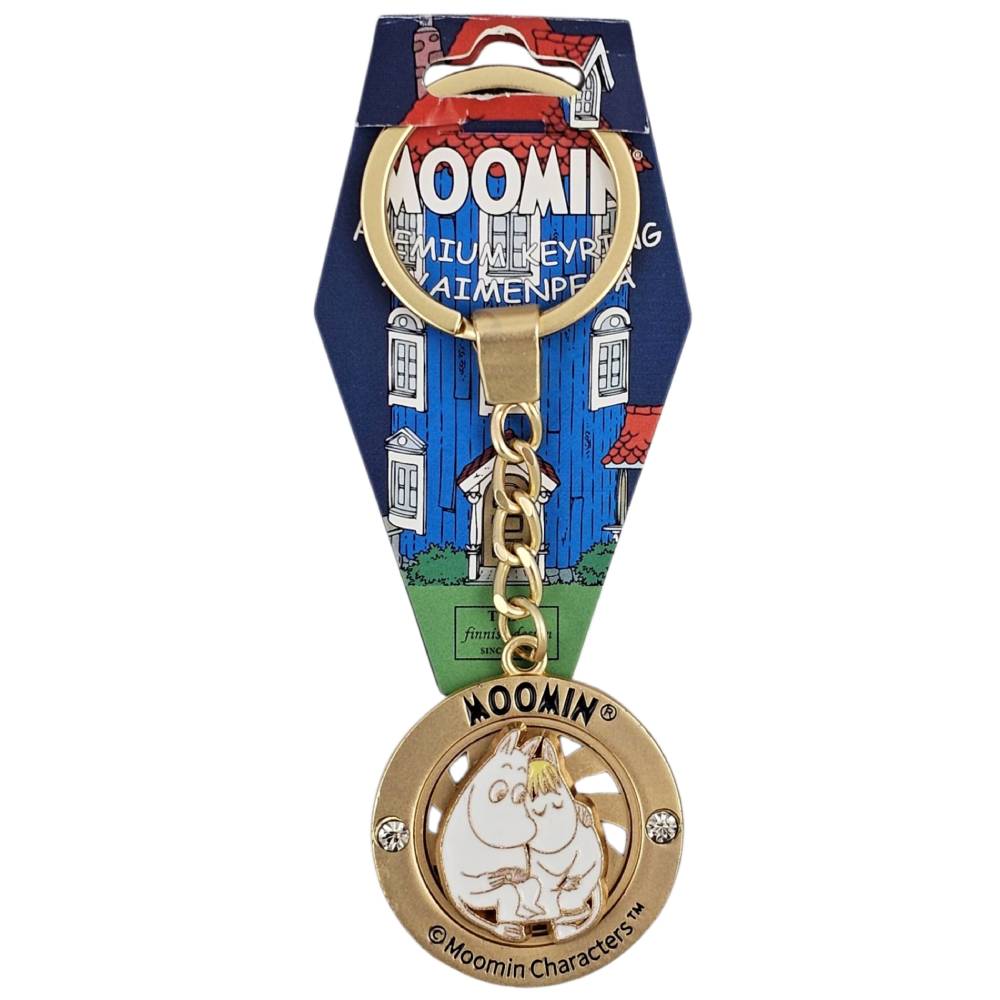 Delightful and fun gold-coloured Moomin keyring with rolling Moomintroll & Snorkmaiden in the middle. Keeps rolling for a long time. Size 4 x 11 x 0,8 cm.