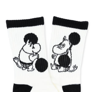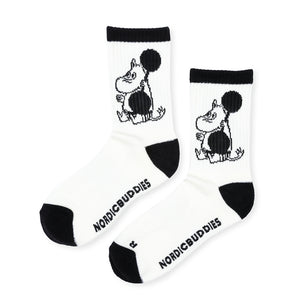 White and black-coloured socks Moomintroll, size EU 36-42. Material: 60% Cotton, 33% Polyester, 4% Nylon 2% Elastane, 1% Elastodiene. Delicate wash 30 degrees.