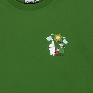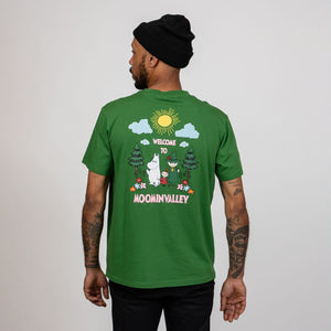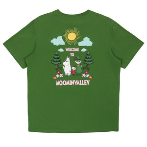 A soft and comfortable Moomin T-shirt for adults. Unisex fit with short sleeves and a round neckline. Length from shoulder to hem in size S is 70 cm. "Welcome to Moominvalley" text on the back of the shirt.