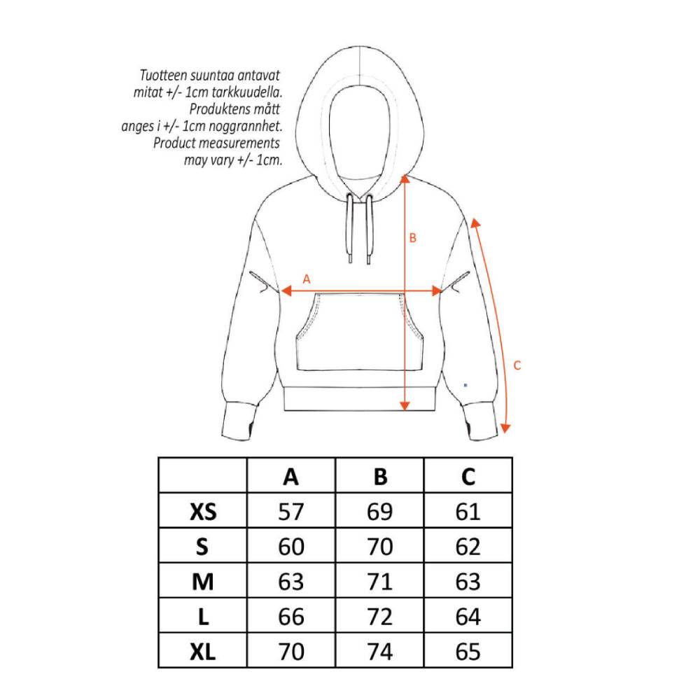 A stylish and street cred Moomin hoodie for adults. Unifit design with loose hood, kangaroo pocket and long sleeves with thumbholes on cuffs. Made from french cotton fabric with loop back. The length from shoulder to hem in size S is 70 cm.