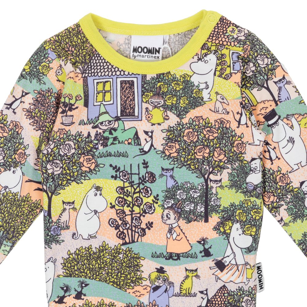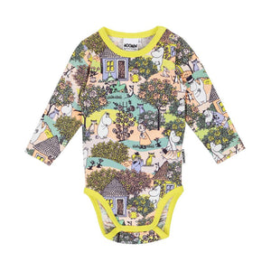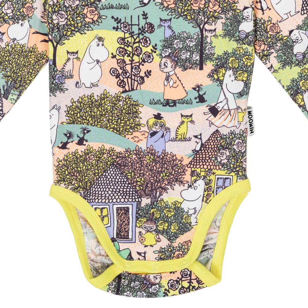 A soft and comfortable Moomin bodysuit for babies. The long-sleeve bodysuit has snap buttons on the shoulders and at the crotch, with extra space for a diaper. The bodysuit is made with certified organic cotton blend.