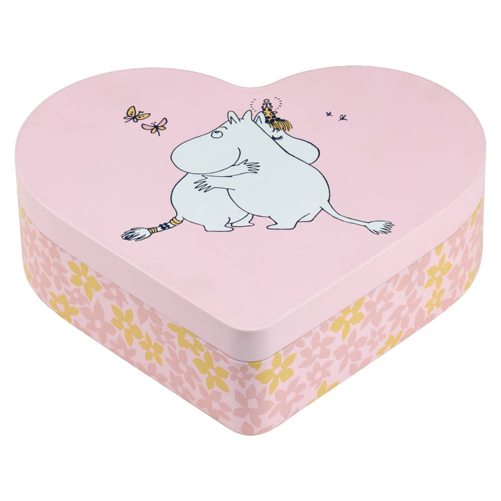 This heart-shaped Moomin tin features a beautiful floral pattern on the sides and a charming illustration of Moomintroll and Snorkmaiden sharing a hug on the lid. Fill it with treats, little treasures, or give it as a heartfelt gift to someone special. Food-safe for dry foodstuffs only. Colours may fade; keep out of direct sunlight. Wash before use. Handwash only. Dry carefully. Size 18 x 14,5 x 5 cm.