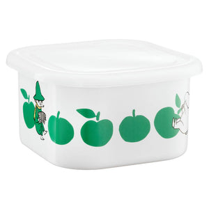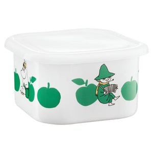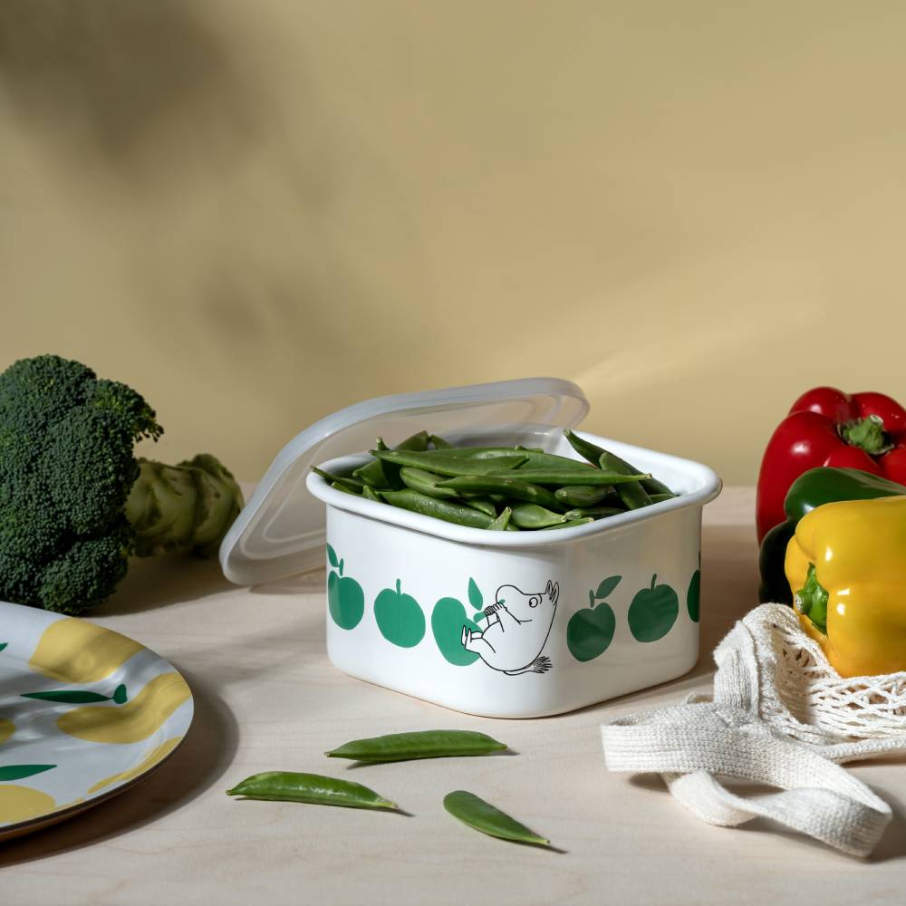 Join Moomintroll and his friends for a joyful day of apple picking. Moomin enamel jar with a lid in plastic and volume of 1,5 liters. Classic white enamel combined to fresh and bright colors gives a retro feeling to this new Moomin by Muurla collection, Joyful Apples. Mix and match different pieces to brighten up your kitchen or pack them all with you for a lovely picnic. Joyful Apples enamel jars are perfect for storing snacks and any foodstuff. They can also be used as a lunch box. The plastic lid keeps the jar sealed and your snacks fresh. Dishwasher safe. Do not use in microwave oven.
