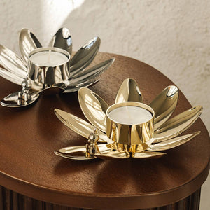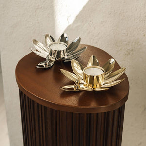 Inspired by Tove Jansson’s first Moomin book, where Moomintroll rides on a water lily to escape danger, this candle holder symbolizes safety and inner peace. The exclusive design features a beautifully crafted nickel-plated brass water lily with a finely detailed sculpture of Little My, resting calmly on one of the leaves.