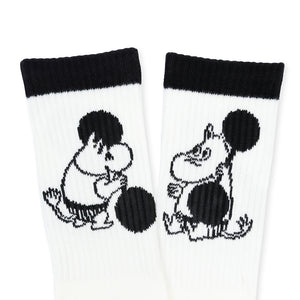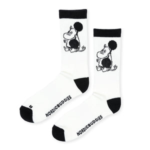 White and black-coloured socks Moomintroll, size EU 40-45. Material: 60% Cotton, 33% Polyester, 4% Nylon 2% Elastane, 1% Elastodiene. Delicate wash 30 degrees.