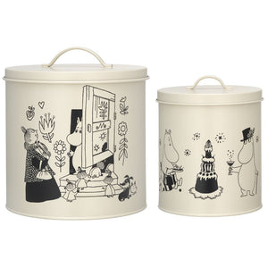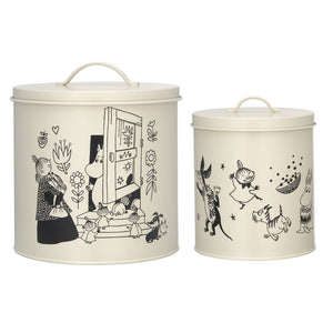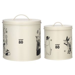 Moomin for Pets tin storage jar suit for the storage of dry food and treats, and any small supplies of your pet. Heights 19 & 21 cm. Diameters 16cm and 21,5 cm. Material is powder coated galvanized steel. Hand wash only.