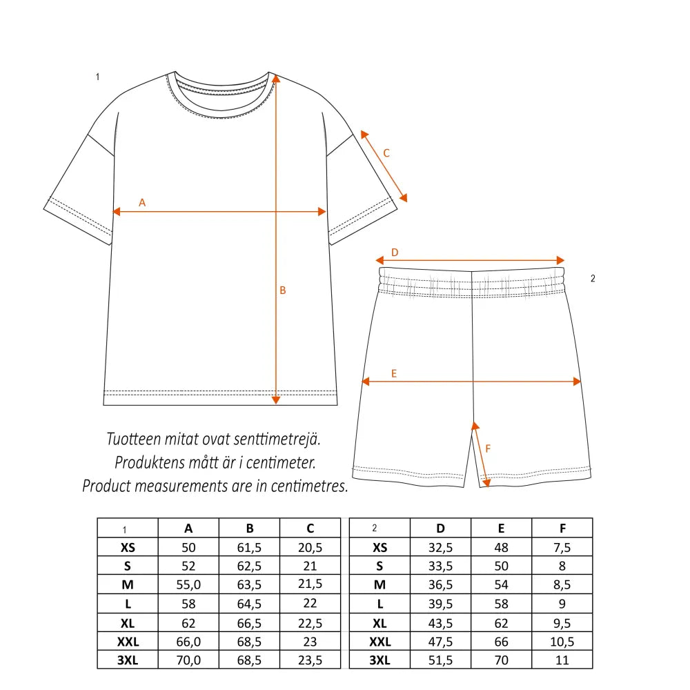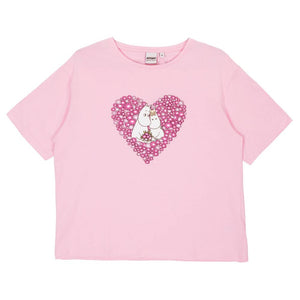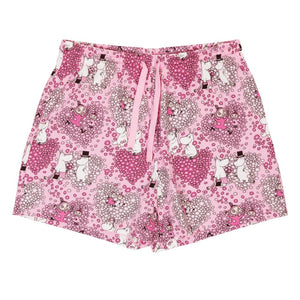 A two-piece Moomin pyjama set for women. The oversized shirt has short sleeves and a round neckline. The short pants have an elastic waistband with a drawstring. Made from soft cotton fabric. 40 °C – Wash inside out with similar colours; do not tumble dry; iron on the reverse side. Sweet dreams!