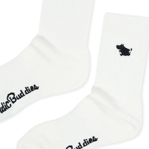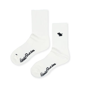 White tennis socks Moomintroll, size EU 36-42. Material: 67% Cotton 25% Polyester 4% Elastodiene 3% Nylon 1% Elastane. Delicate wash 30 degrees.