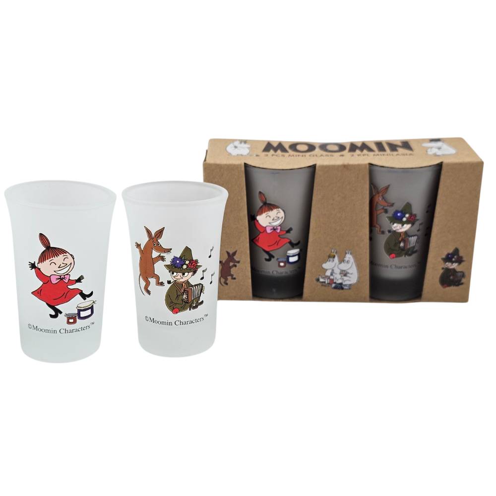 Lovely Moomin frosted mini glass set with Little My and with Snufkin & Sniff glasses. Take your healthy smoothie shots every morning! Hand wash preferred. Wash before first use. Size: 4,2 x 7 cm / 5 cl / one glass.