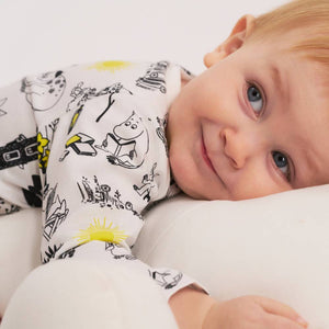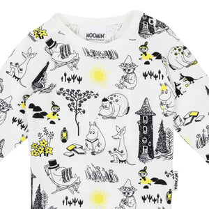A soft and comfortable Moomin bodysuit for babies. The long-sleeve bodysuit has snap buttons at the shoulders and crotch. With extra space for a diaper. The bodysuit is made with certified organic cotton blend.