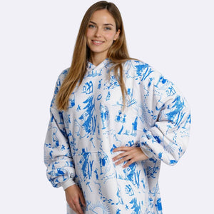 Cozee has a huge plush hood, which keeps your head cozy and can even double as a pillow. A huge special pocket keeps your hands warm and can store all your essentials. Oversized sleeves that are designed so that you can easily pull your arms in to cover yourself completely for total coziness.