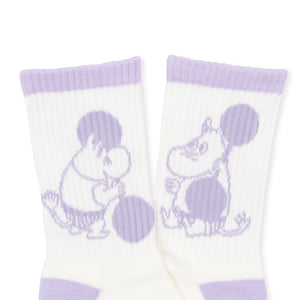 White and violet -coloured socks Moomintroll, size EU 40-45. Material: 60% Cotton, 33% Polyester, 4% Nylon 2% Elastane, 1% Elastodiene. Delicate wash 30 degrees.