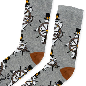 Grey and black-coloured socks Moominpappa with Helm, size EU 40-45. Material 60% Cotton, 33% Polyester, 4% Nylon, 2% Elastane, 1% Elastodiene. Delicate wash 30 degrees.