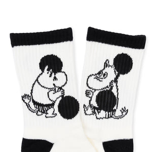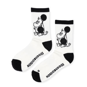 White and black-coloured socks Moomintroll, size EU 40-45. Material: 60% Cotton, 33% Polyester, 4% Nylon 2% Elastane, 1% Elastodiene. Delicate wash 30 degrees.