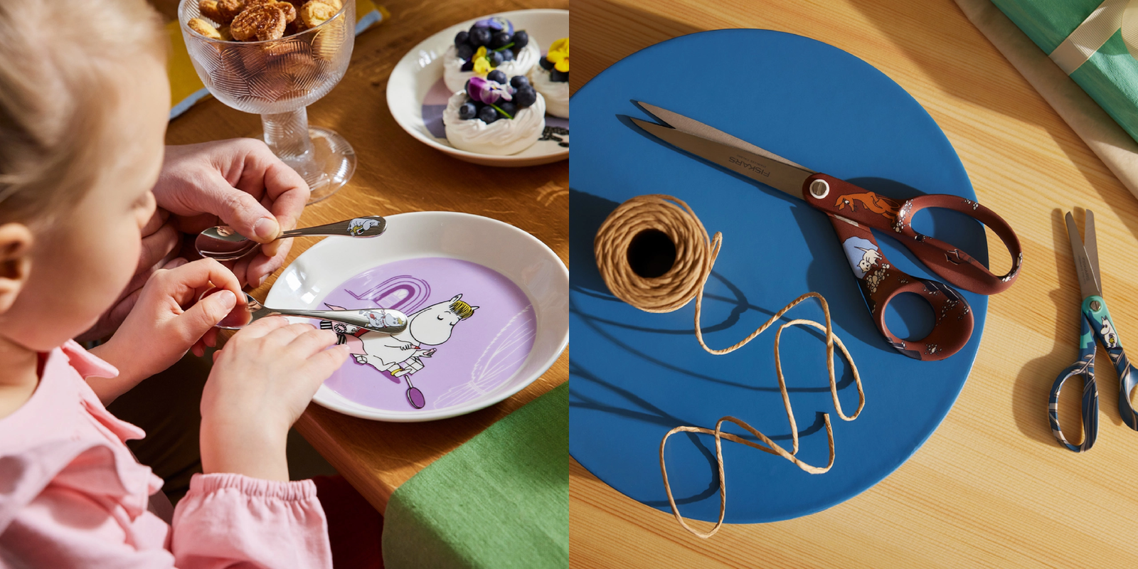 Discover the charming Hackman cutlery and the durable, high-quality Fiskars scissors, both designed to bring some Moominousity to your kitchen and table settings.