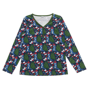 Comfortable two-piece Moomin Christmas pyjamas for women. The feminine fit shirt has long sleeves and a V-neckline with snap buttons. The pants have long legs and elastic waistband. Made from cotton.