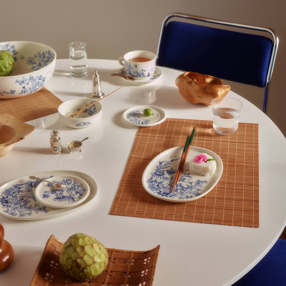 The harmonious blue-and-white collection with a touch of Japanese is an ode to Tove Jansson’s life and work. The design is inspired by the soft, tactile forms of the rocky island of Klovharun, called Haru, where Tove spent her summers. Haru is also Japanese and means spring. The illustrations are inspired by wreaths designed by the artist herself, celebrating the island's flora.