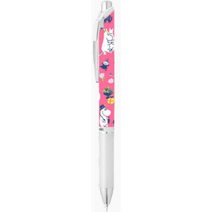 Pentel EnerGel Gel Ink Pen with Unique Moomin Design. Known for its unique ink that does not smudge, dries extremely quickly, and is therefore suitable for heavy writers and left-handed users. EnerGel pens are very lightweight and equipped with a white rubber grip area. The pens are refillable with LR7 cartridges and made from 54% recycled material. The barrel features decorative Moomin print. 0.35 mm line strength (0.7 mm ballpoint). Blue writing color. Made in Japan.