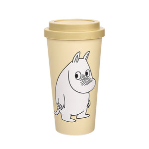 Biodegradable beige take-away mug featuring Moomintroll with rotating lid and removable sleeve. Re-use cuts daily consumer waste and helps our planet. This cup and its lid are made of PLA, a completely biodegradable and renewable material. It looks like plastic, but it actually contains NO fossil-based plastic. The sleeve is made of food-grade silicone that is recyclable. Material:Food Grade Silicone / 450ml / PLA. Machine washable.
