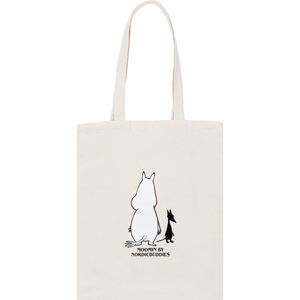 A Moomin tote bag featuring Moomintroll from Nordicbuddies. Size 38,5 x 35 x 0,3. Material 100% Cotton. Hand wash only. Great tote bag for carrying groceries back home!